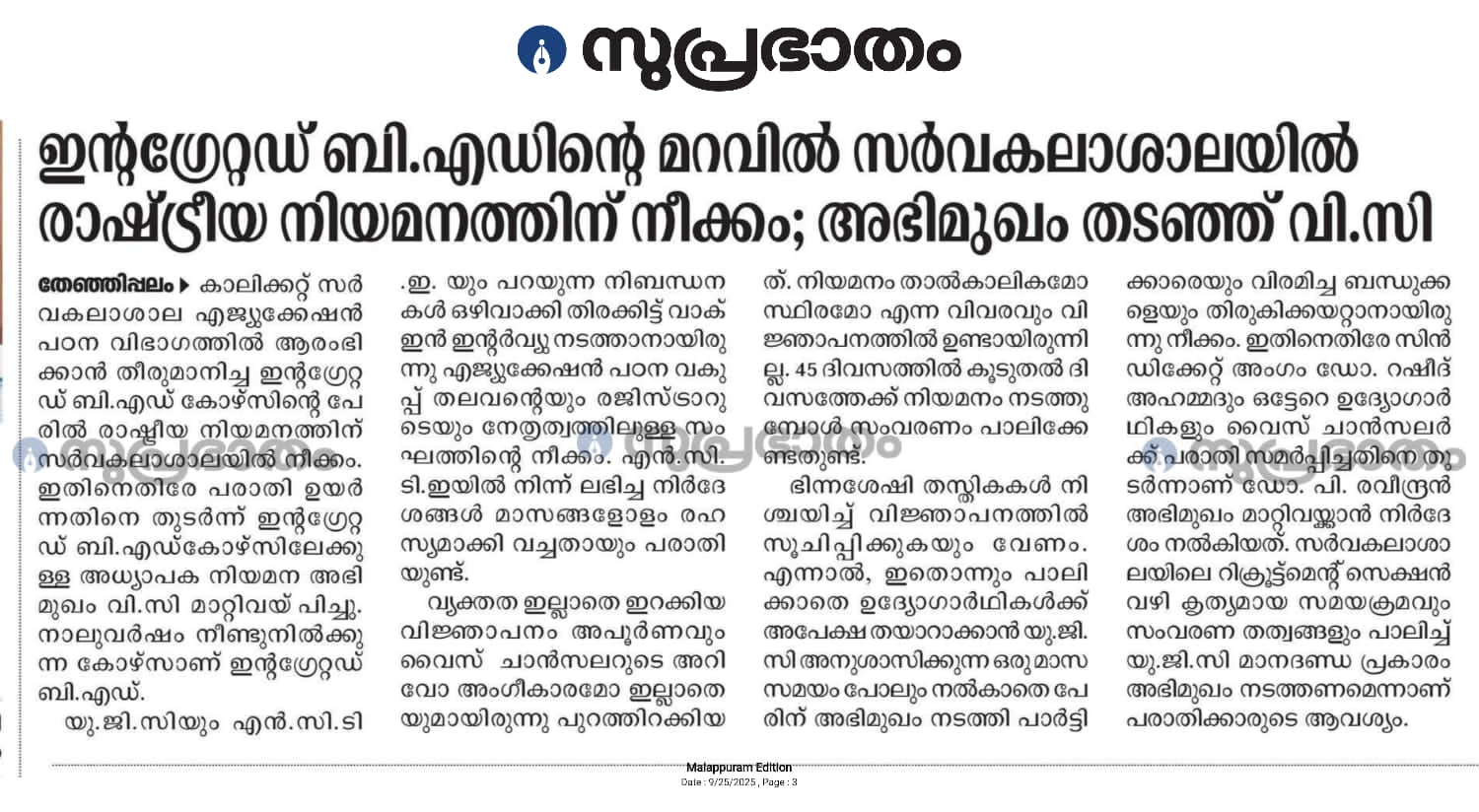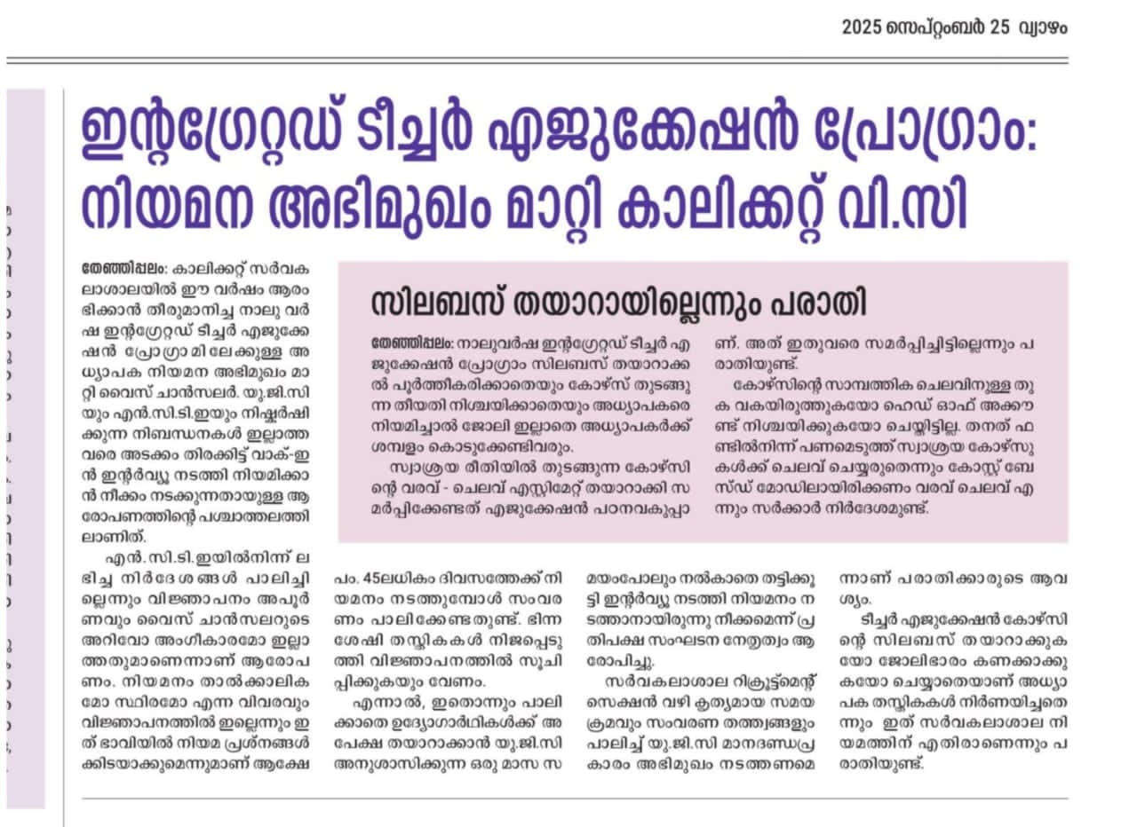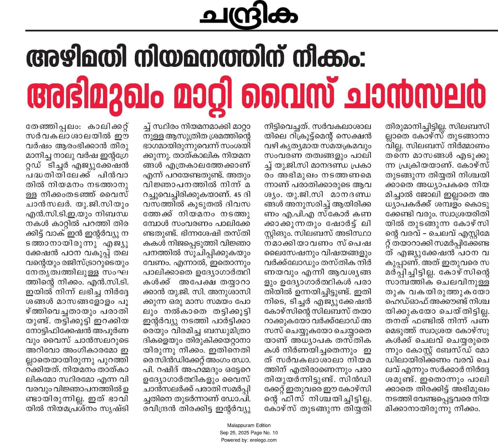 Calicut University/ Reservation violation/Teacher Appointment/Manorama/09/10/25